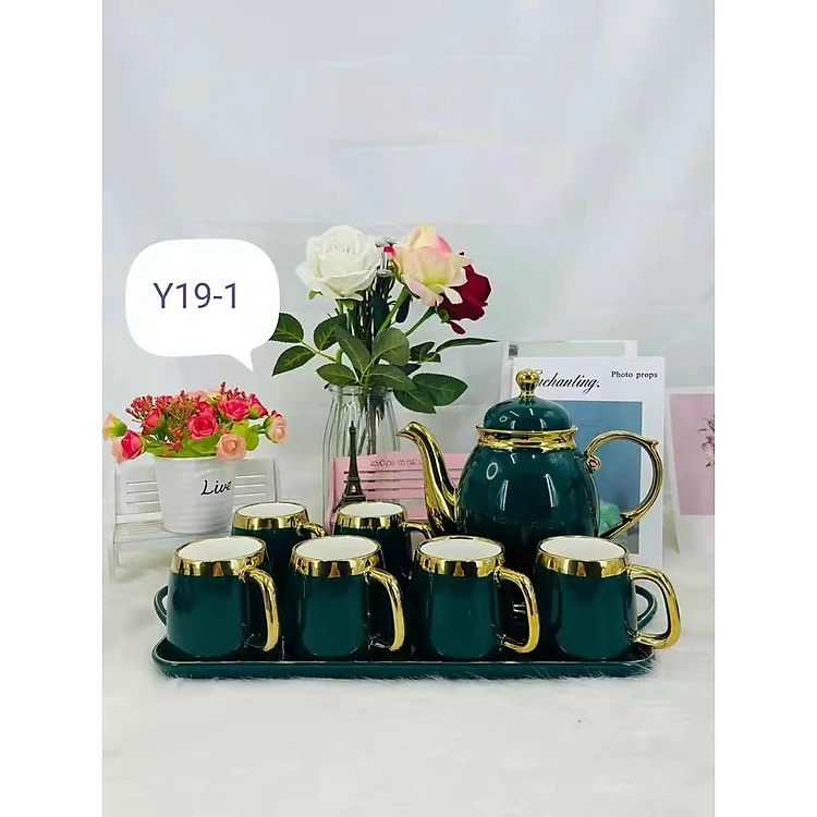 BỘ ẤM CHÉN KÈM KHAY SỨ CAO CẤP PHA TRÀ CÀ PHÊ MÀU XANH CỔ VỊT VIỀN VÀNG