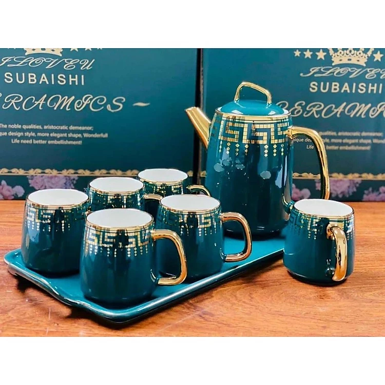 BỘ ẤM CHÉN KÈM KHAY SỨ CAO CẤP PHA TRÀ CÀ PHÊ XANH HỌA TIẾT MẮT XÍCH