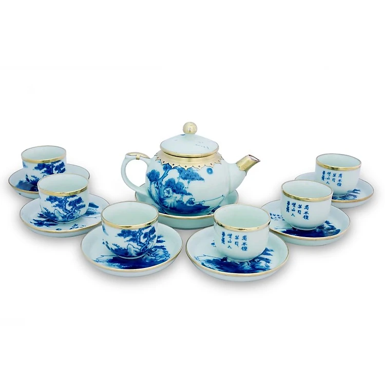 Bộ ấm chén men lam, lã vọng câu cá dáng chuông