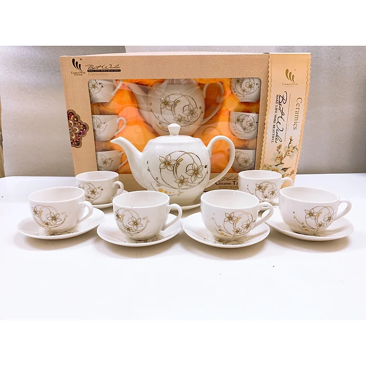 Bộ ấm chén pha trà kèm 7 đĩa CAMELLIA họa tiết hoa dây bạc sang trọng - ANTH240
