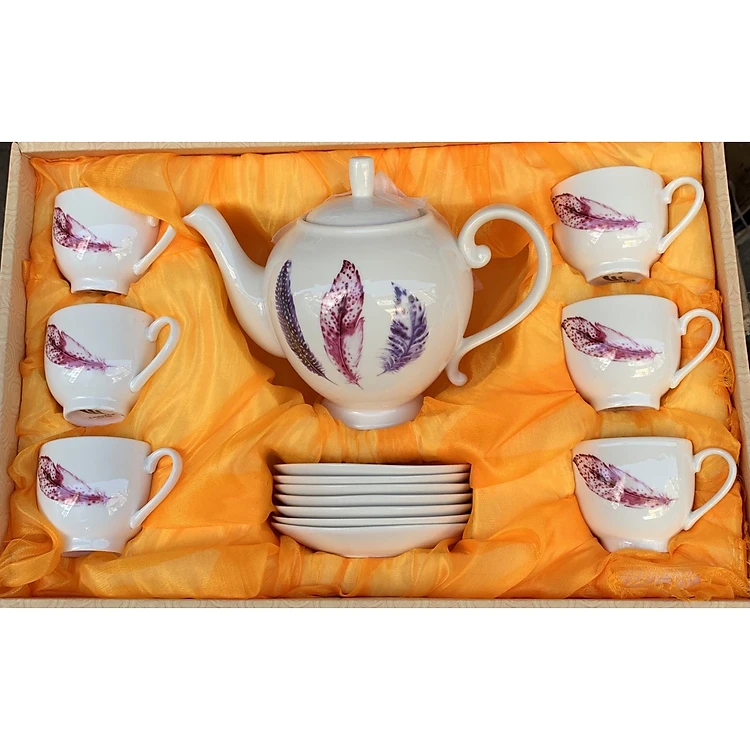 Bộ ấm chén pha trà sứ trắng họa tiết lông vũ tím