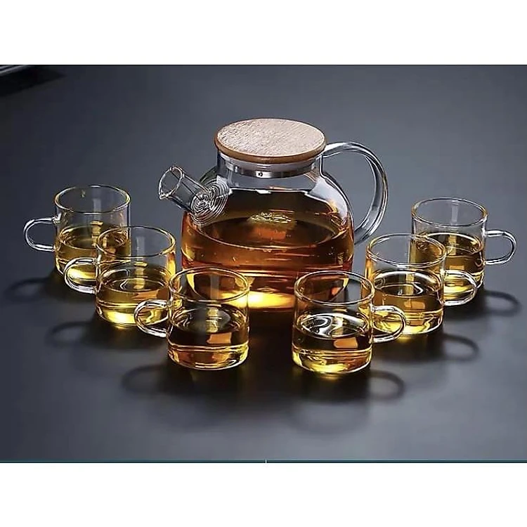 Bộ ấm chén pha trà thủy tinh 1000ml chịu nhiệt nắp gỗ
