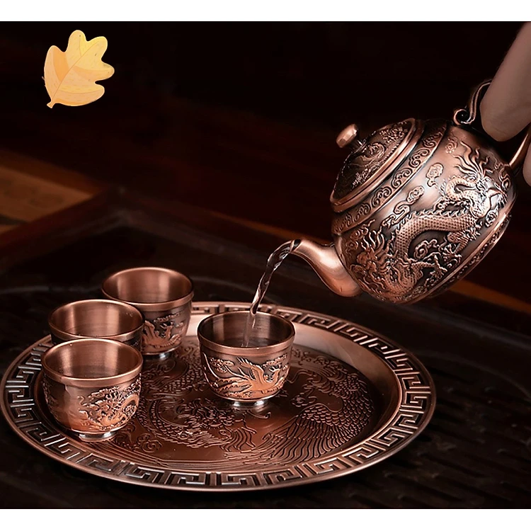 BỘ ẤM CHÉN TRÀ BẰNG ĐỒNG GIẢ CỔ HỌA TIẾT RỒNG - VD95