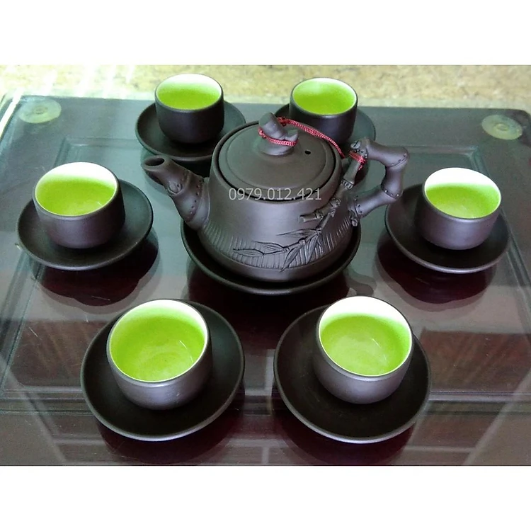 Bộ ấm chén tử sa Bát Tràng đắp nổi trúc đen