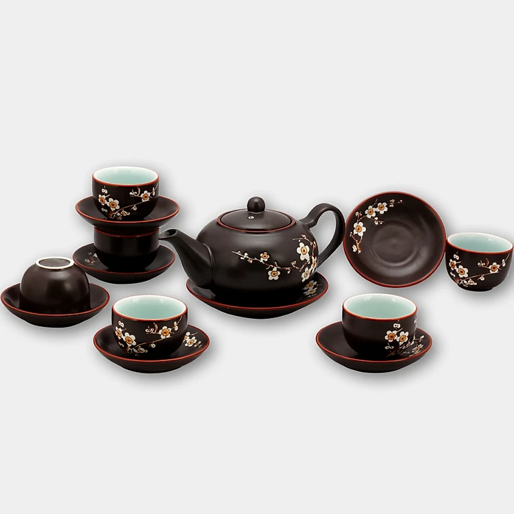 Bộ ấm chén tử sa tròn khắc hoa Đào chính hãng gốm sứ Bát Tràng (bộ bình uống trà, bình trà)