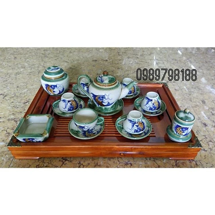 Bộ ấm chén vẽ cá đủ phụ kiện kèm khay gỗ