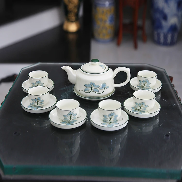 Bộ ấm chén vẽ sen xanh gốm sứ Bát Tràng