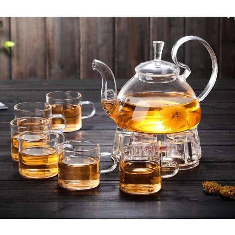 Bộ ấm pha trà thủy tinh tay vồng kèm khay, đế nến, 6 đĩa lót tách