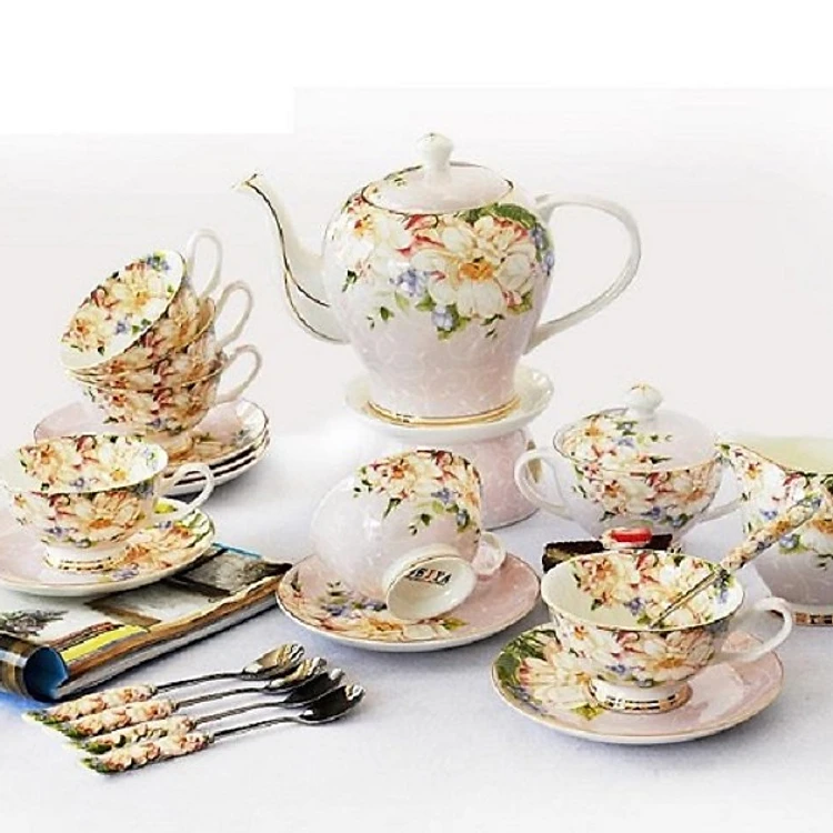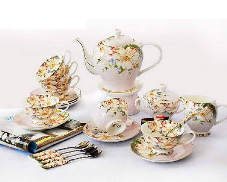 Bộ ấm và tách trà sứ xương gồm 1 bình trà 1200ml, 6 tách 120ml cùng 6 đĩa lót tách có đường kính mỗi đĩa 12,5cm, 01 Rót sữa, 01 bình đựng đường