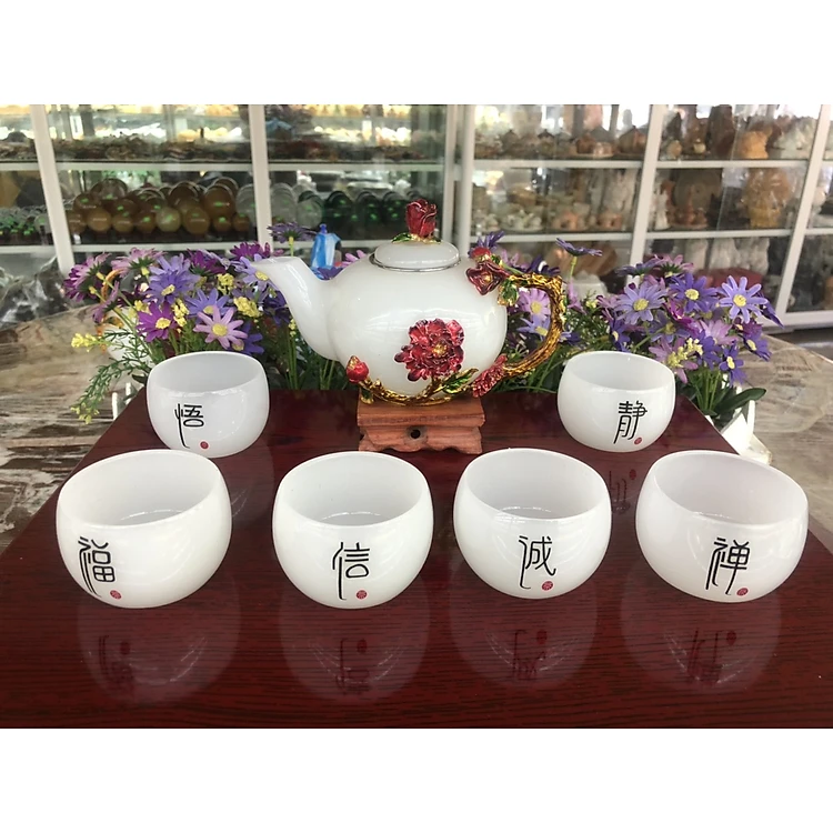 Bộ ấm trà chạm bông hoa mẫu đơn đá bạch ngọc