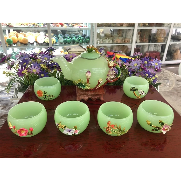 Bộ ấm trà chạm hoa sen đá ngọc cẩm thạch xanh