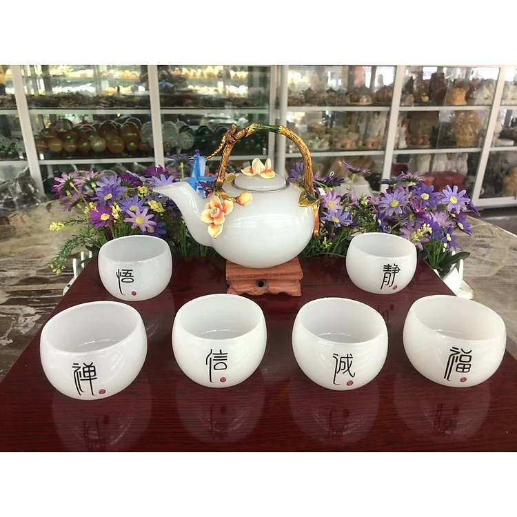 Bộ ấm trà chạm hoa và con chuồn chuồn với quai xách đá bạch ngọc