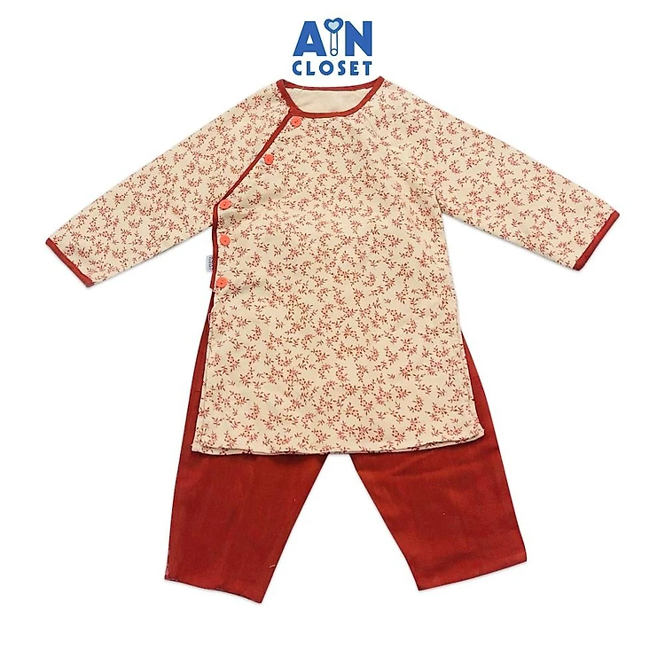 Bộ áo dài bé gái họa tiết Đào đông đỏ thô trà bông - AICDBG3N1IMC - AIN Closet