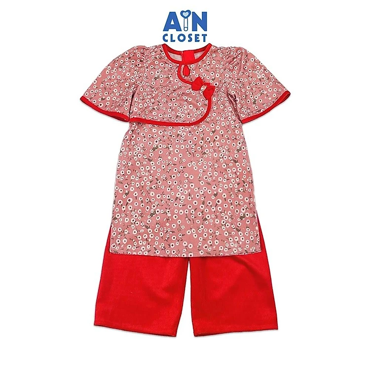 Bộ Áo Dài bé gái họa tiết Hoa Salem Trắng nền đỏ Cotton Nhung - AICDBGEY95L7 - AIN Closet