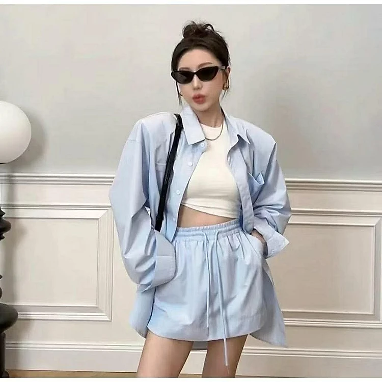Bộ Áo sơ mi dài tay và chân váy ngắn dáng dài oversize màu xanh da trời cho nữ