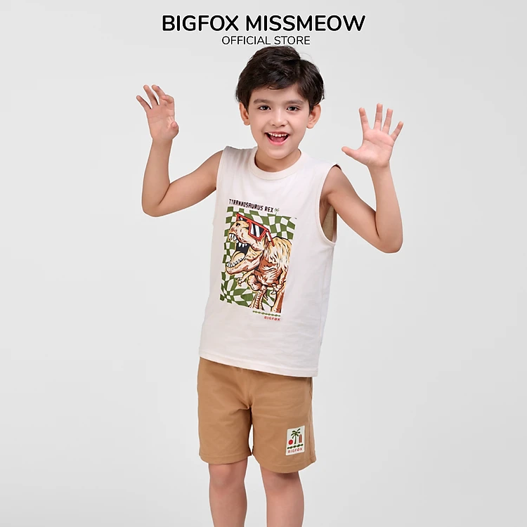 Bộ ba lỗ bé trai Bigfox Miss Meow in khủng long T-rex mùa hè cỡ 3,7,9,11 tuổi 30kg 40kg