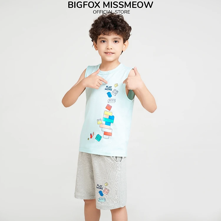 Bộ ba lỗ cho bé trai Bigfox Miss Meow size đại vải cotton xuất Hàn kiểu sát nách cỡ 3,7,9,11 tuổi 30kg 40kg 1930