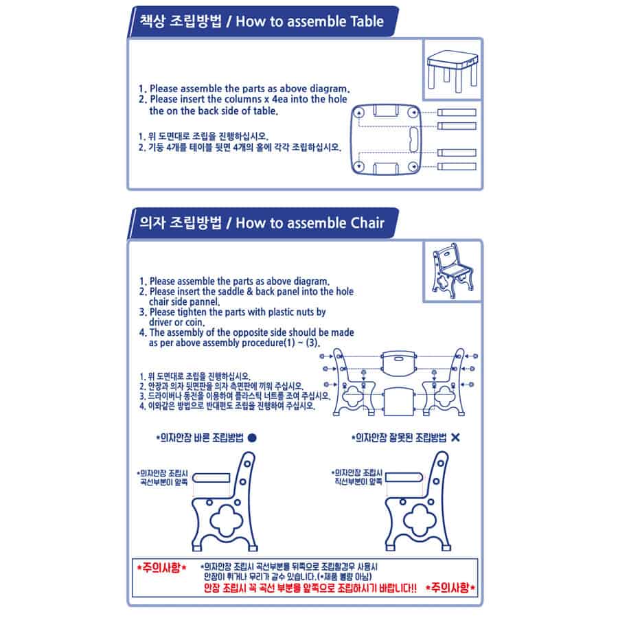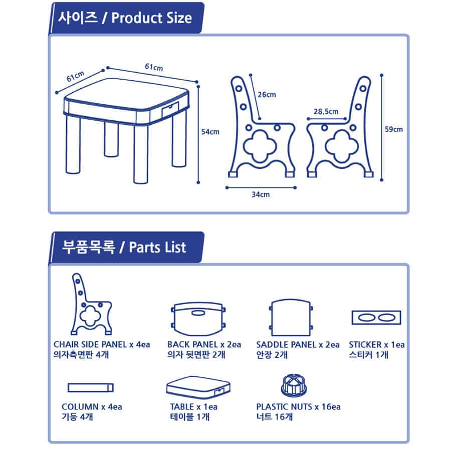 Các bộ phận của bàn và ghế có thể tháo rời đến từng miếng một. Mỗi miếng lắp ráp được chế tạo rỗng, tạo độ chắc chắn khi sử dụng nhưng vẫn nhẹ nhàng khi cần di chuyển.