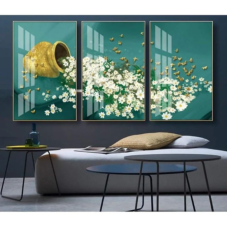 Bộ ba tranh tráng gương cao cấp hoa cúc trắng đẹp long lanh