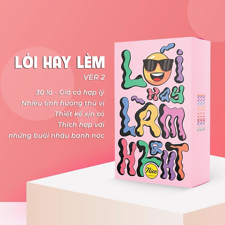 Ét ô ét - Phát tín hiệu để Lói Hay Lèm High giải cứu những cuộc chơi thiếu muối Nếu team bạn đang hết sạch ý tưởng để biến những cuộc chơi trở nên sôi động, mới mẻ, hãy phát tín hiệu ngay cho Nice để được giải cứu nhé! Với siêu phẩm Lói Hay Lèm High vừa ra mắt, tất cả thành viên trong team đều sẽ trở thành nhân vật chính của cuộc chơi. 30 lá bài sẽ tạo ra cho bạn và team những cú twist, bí mật khổng lồ mà bấy lâu chưa từng “tâm sự” với nhau. Các lá bài thử thách tạo ra một không gian kết nối, giúp các thành viên thể hiện bản thân hoặc nâng ly nốc cạn. “Lói hay Lèm High” - “Nói hay Làm”, đây là bộ bài Việt đầu tiên dựa trên trò chơi “truth or dare”. Với mong muốn mang lại sự thú vị và giải trí, trò chơi tạo cơ hội cho mọi người tìm hiểu và gắn kết với nhau hơn. ️ Bạn muốn chơi Truth or Dare nhưng lại không có ý tưởng thì chắc chắn “Lói hay Lèm High” sẽ cần thiết đó nha! Bao gồm 30 lá bài, bộ bài sẽ có 30 truth và 30 dare (mỗi lá có 1 truth và 1 dare). Mỗi lần có thể bốc những lá khác nhau, vậy nên có thể chơi đi chơi lại nhiều lần. Luật chơi: + Bắt đầu chơi theo vòng tròn, tới lượt của bạn, bạn phải oẳn tù tì với người đối diện. + Nếu bạn thắng, bạn có quyền lựa chọn “truth”’ hoặc “dare”. Nếu bạn thua, người đối diện đó sẽ lựa chọn giúp bạn. + Nếu trúng “truth”, bạn bắt buộc phải trả lời thật lòng câu hỏi có trên lá bài. + Nếu trúng “dare”, bạn bắt buộc phải làm theo thử thách được viết trên lá bài. Lưu ý:️ + Hãy sưu tập 2 bộ Lói hay Lèm High để có trải nghiệm chơi vui nhất nhé + Phải chọn “truth” hoặc “dare” trước khi bốc bài. + Có chơi có chịu, đã dấn thân vào trò chơi này là phải trung thực trả lời câu hỏi hoặc nghiêm túc làm theo việc được yêu cầu nha :) “Đừng lươn lẹo để rồi tình bạn chìm xuống vực đáy” ------------------------------------------------------------------------------------ Xuất xứ : Việt Nam Kích thước : 6x9cm Lói hay Lèm High là sản phẩm sáng tạo nối tiếp sau thành công của Lói hay Lèm. Team hy vọng sự đầu tư trong từng khâu làm thành phẩm sẽ nhận lại được sự ủng hộ và quan tâm của các bạn. Nhanh tay cho bộ bài vào giỏ hàng ngay để khuấy động cuộc vui của team mình nhé! ̛ ́ đ̉ ̉ ̀ ̛̉ ̣ đ̂̀ ̂́ ́ ̂̀ ̣ ́ ^^ . Đ̃ ̀ ̂ ́ ̛̛̣