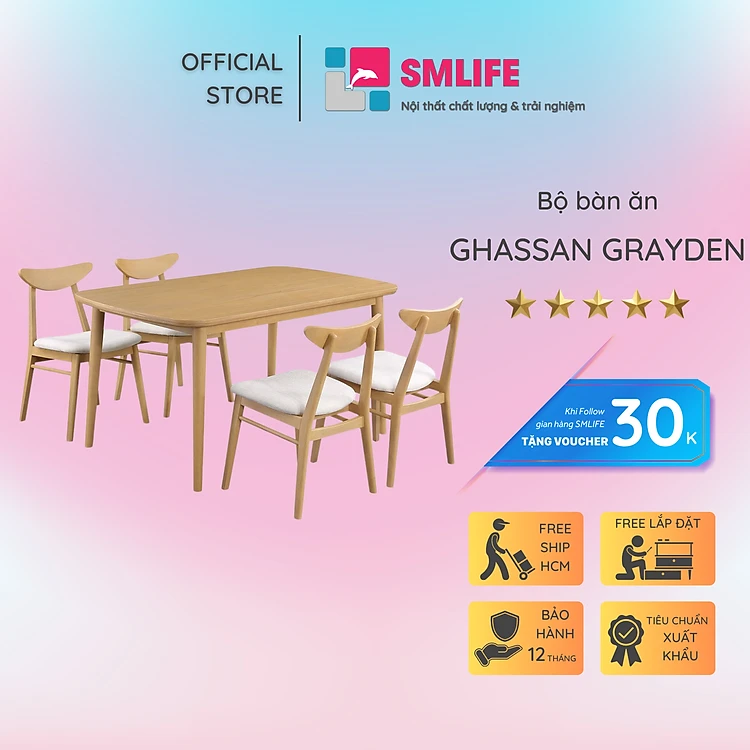 Bộ bàn ăn 4 ghế gỗ vân veneer xoan đào hiện đại SMLIFE Ghassan Grayden | D150 x R90 x C76 | gỗ Cao Su và Veneer xoan đào