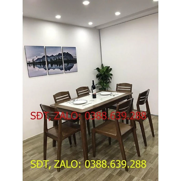 Bộ Bàn Ăn 6 Ghế Chân Chéo, Mặt Đá, Ghế Liền ( Hàng Kỹ)