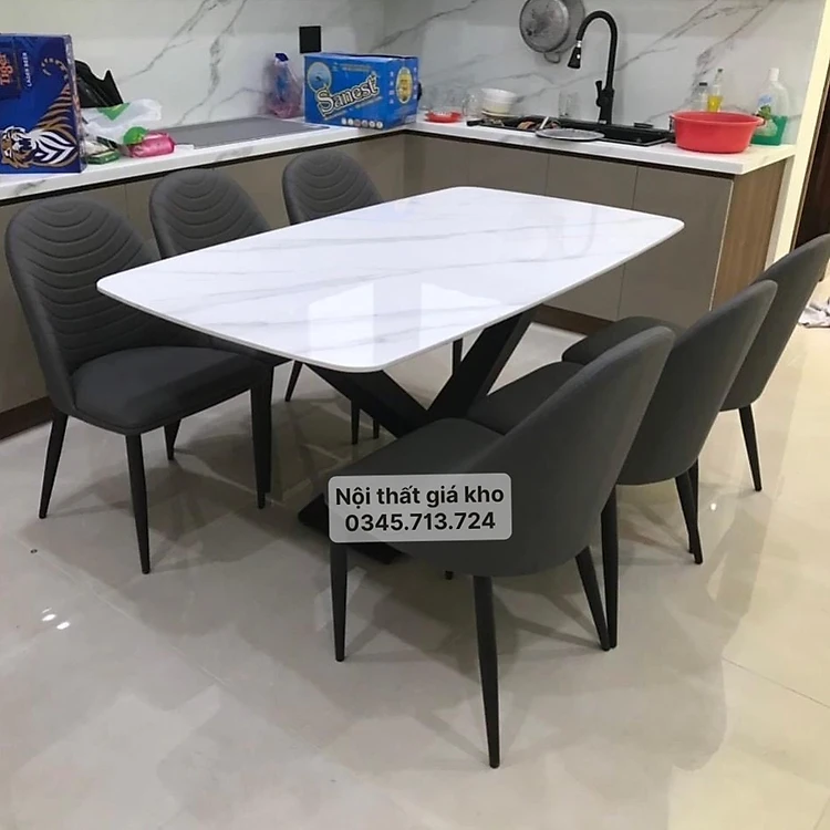 Bộ bàn ăn mặt đá Ceramic bóng chân chéo chữ X kết hợp ghế Leaf