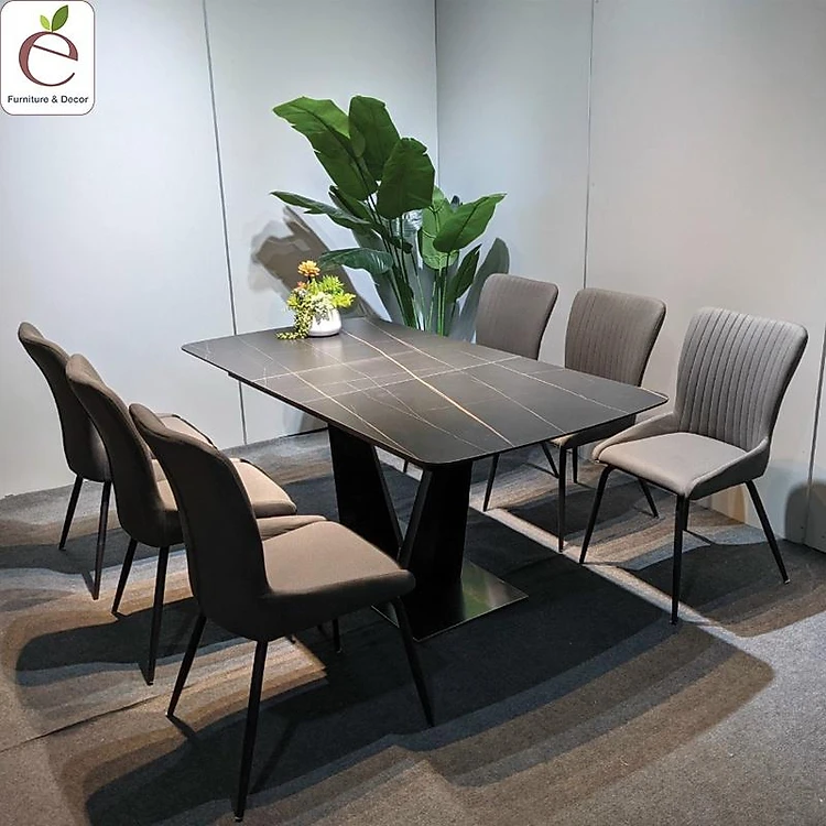 Bộ Bàn Ăn Chân V Mặt Đá Ceramic 6 Ghế Juno Nhập Khẩu là dòng bàn ăn mặt đá nhập khẩu cao cấp. Đây là mẫu bàn ăn bán chạy nhất hiện nay thiết kế mặt đá Ceramic chống xước, chống thấm độ bền cao. Kiểu dáng chân chữ V đẹp mắt, chân làm bằng kết cấu hợp kim sơn tĩnh điện, sơn đen chống xước, cứng cáp chịu được điều kiện khí hậu nóng ẩm.