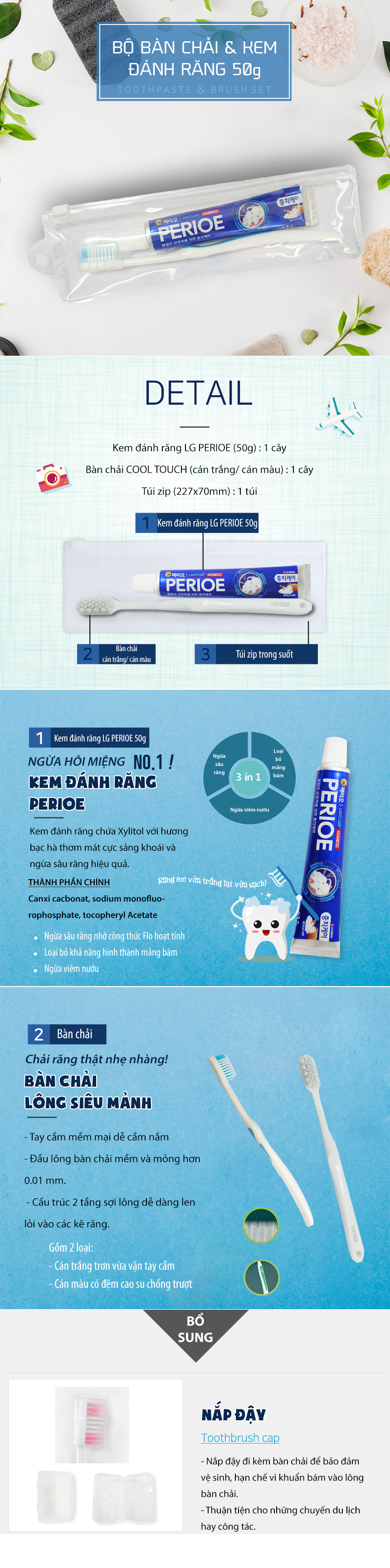 - Gồm 1 bàn chải đánh răng COOL TOUCH và 1 kem đánh răng PERIOE 50g.