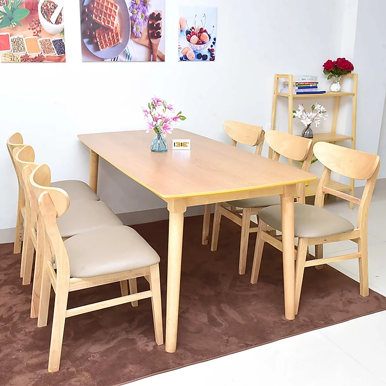 Tùy chọn 4 ghế có kích thước bàn là 1200 x 800 x 750mm, 6 ghế có kích thước bàn là 1650 x 800 x750 mm, mặt gỗ MDF veneer đảm bảo độ bền và tăng tính thẩm mỹ.