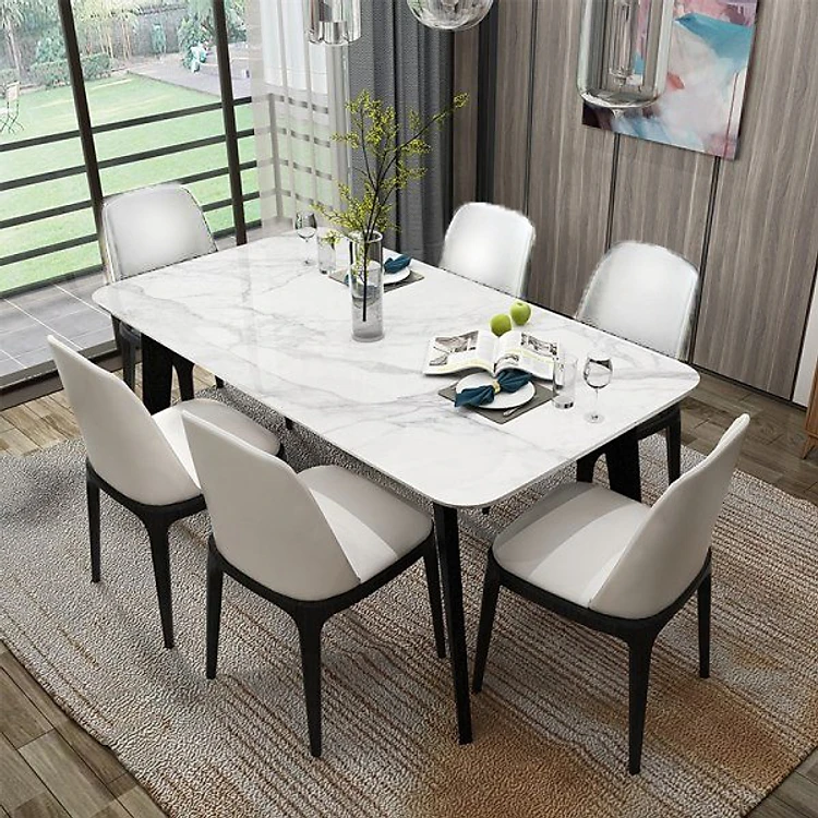 Tham khảo ngay bộ bàn ghế bao gồm: Bàn ăn với mặt đá trắng vân mây, chân sắt và 4 ghế Grace không tay siêu cao cấp của QT nhé
