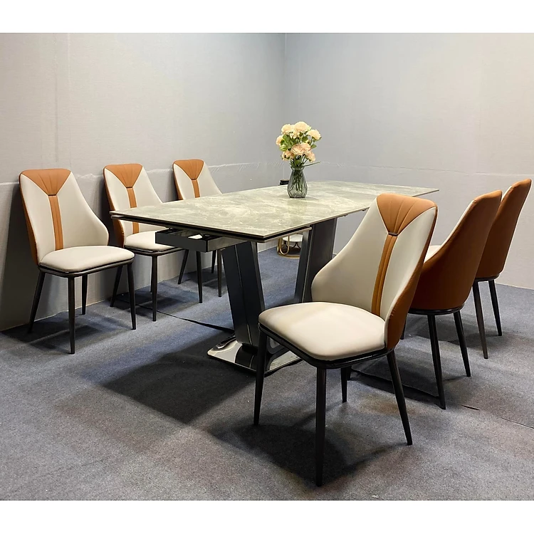 Bộ bàn ghế phòng ăn Juno sofa mặt đá ceramic, chân inox mạ titan kèm 6 ghế