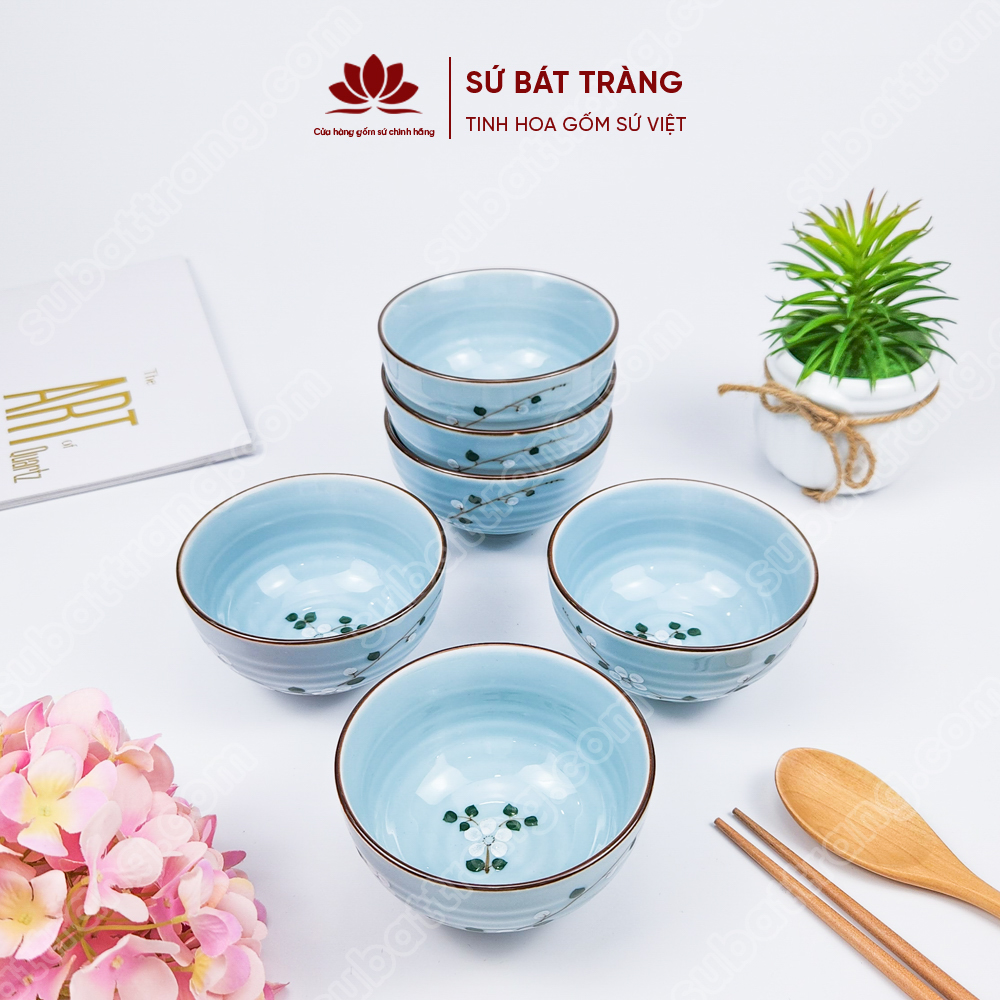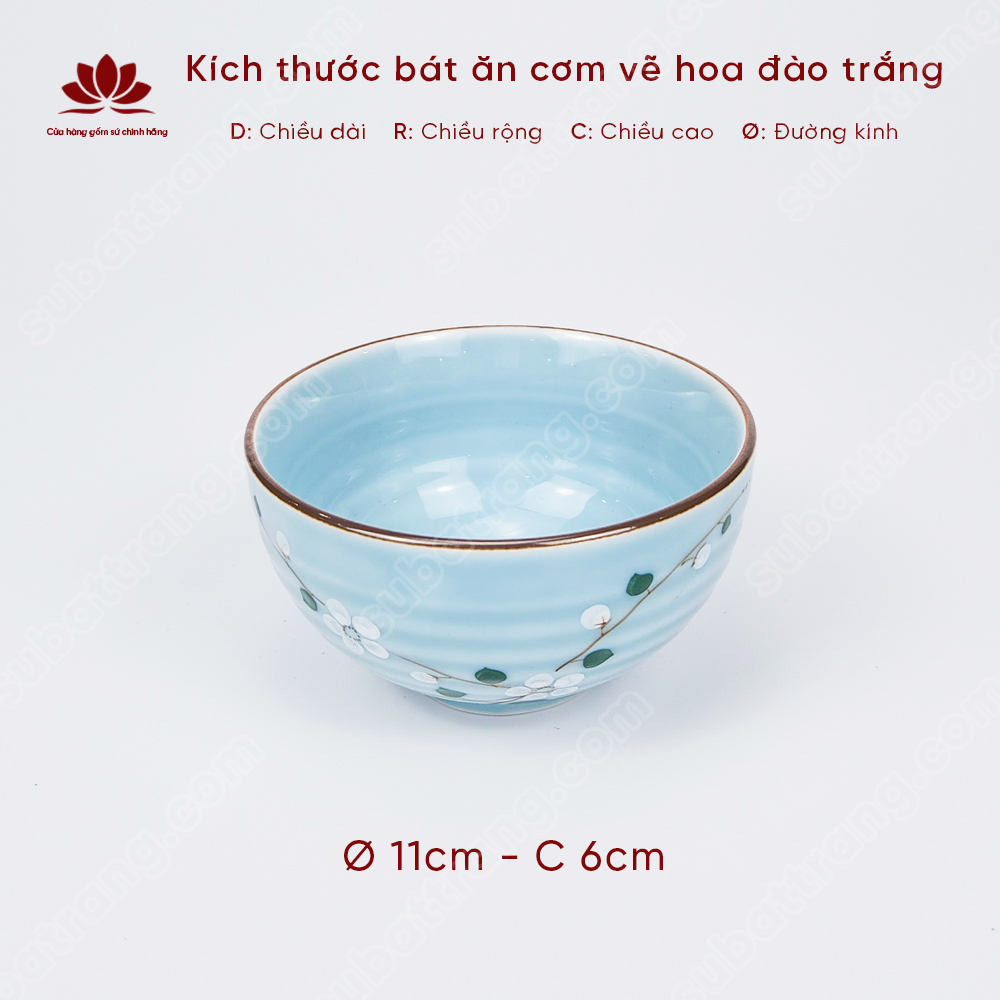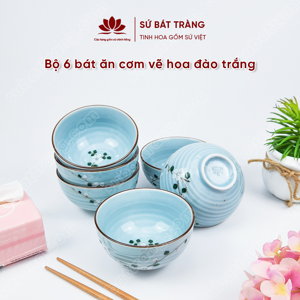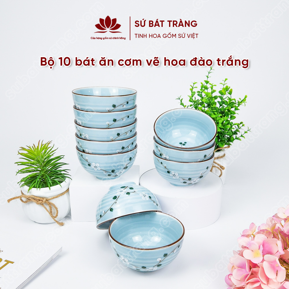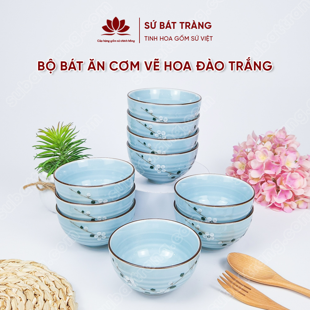 Bộ bát ăn cơm vẽ hoa đào trắng sứ Bát Tràng đẹp - Bộ 10 và 6 bát
