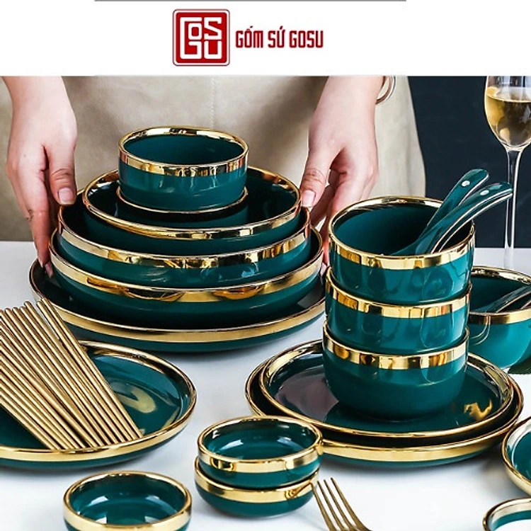 Bộ Bát Đĩa Cao Cấp, Chén Đĩa Decor Đẹp 26 Chi Tiết Xanh Viền Vàng Phong Cách Bắc Âu