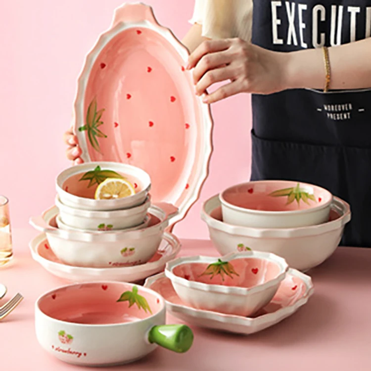 Bộ bát đĩa chén đĩa cao cấp thương hiệu Gosu họa tiết dâu tây hồng dễ thương sáng mịn an toàn