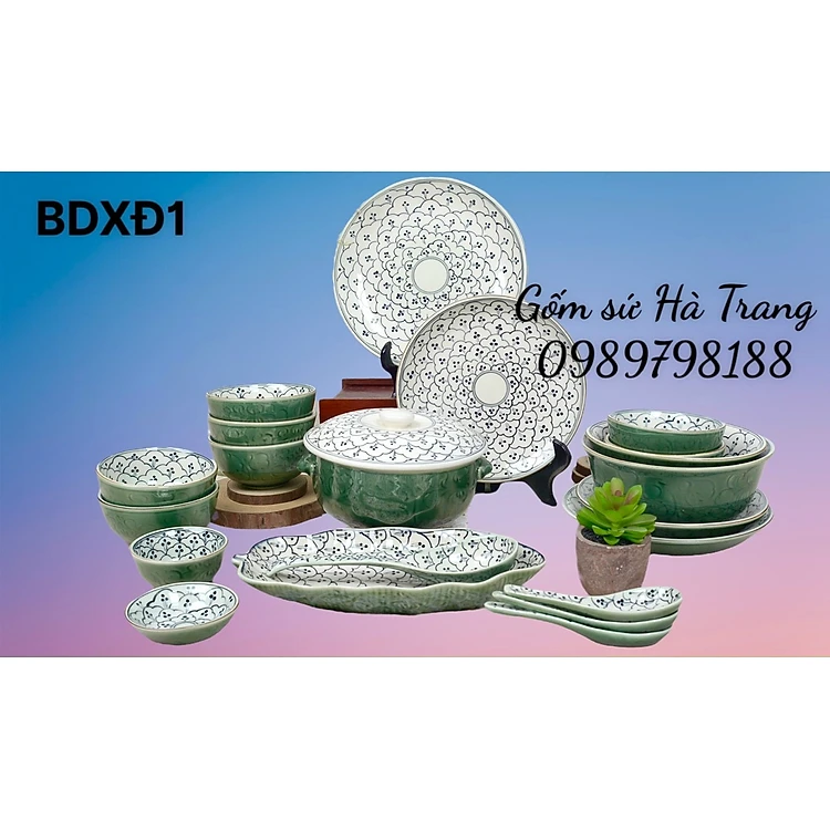 Bộ bát đĩa gốm sứ Bát Tràng cao cấp men lục bảo vẽ bèo dâu BDXĐ1