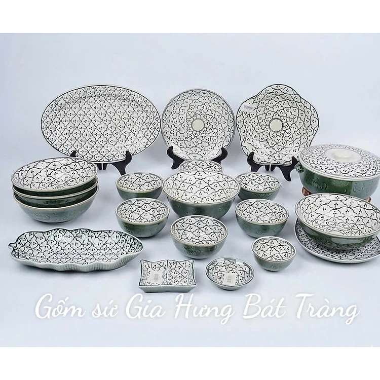 Bộ bát đĩa gốm sứ Bát Tràng cao cấp men lục bảo vẽ bèo dâu BDXĐNV02