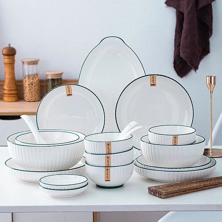 Bộ bát đĩa gốm sứ Phương Đông trắng viền xanh sang trọng, chén dĩa decor trang nhã, tặng kèm bộ đũa gỗ