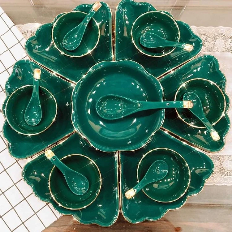 Bộ bát đĩa hoa mặt trời, men khử xanh cổ vịt. Gốm sứ Bát Tràng cao cấp
