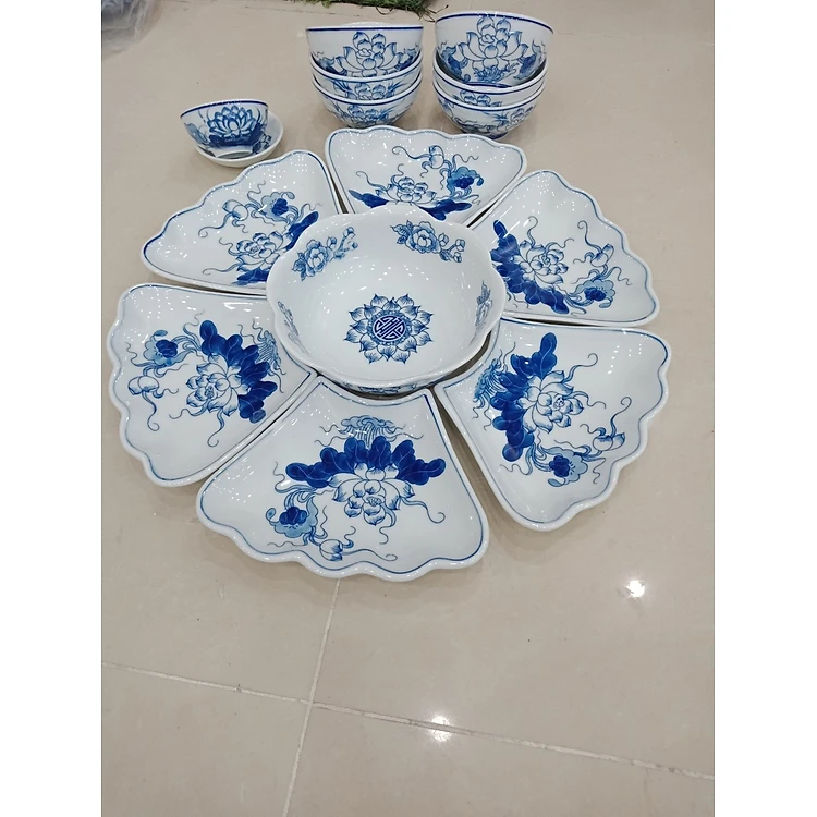 Bộ Bát Đĩa Thờ Cúng Men Lam Cổ Vẽ Sen Hoặc Rồng Song Long Chầu Nguyệt