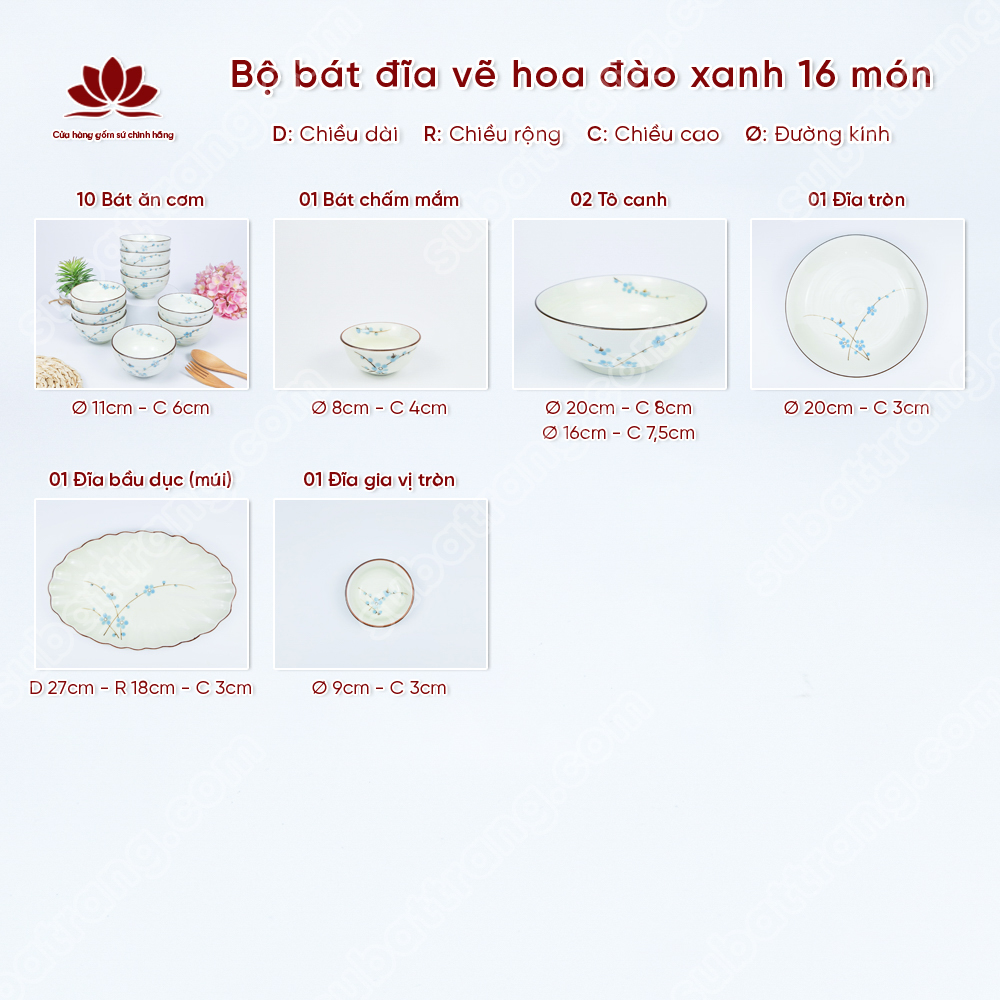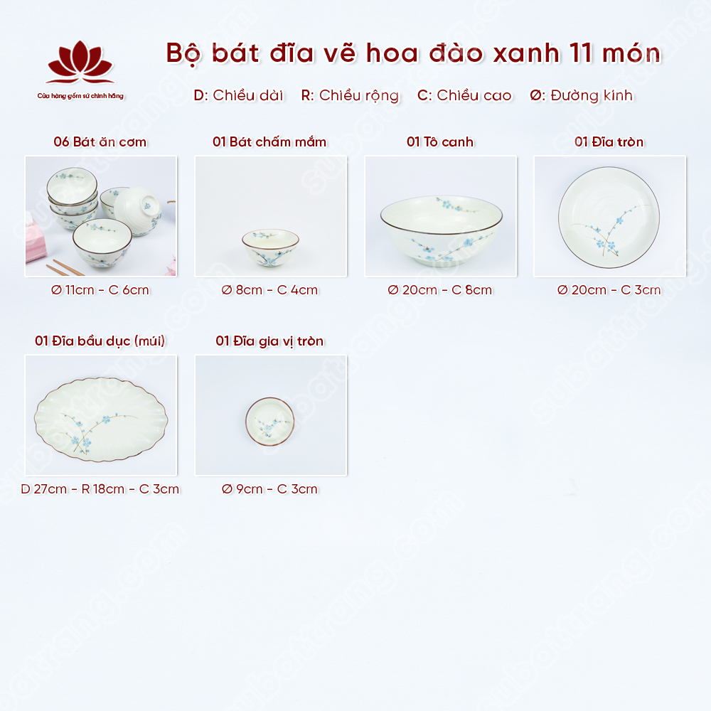 Sản phẩm: Bộ bát đĩa vẽ hoa đào xanh cao cấp