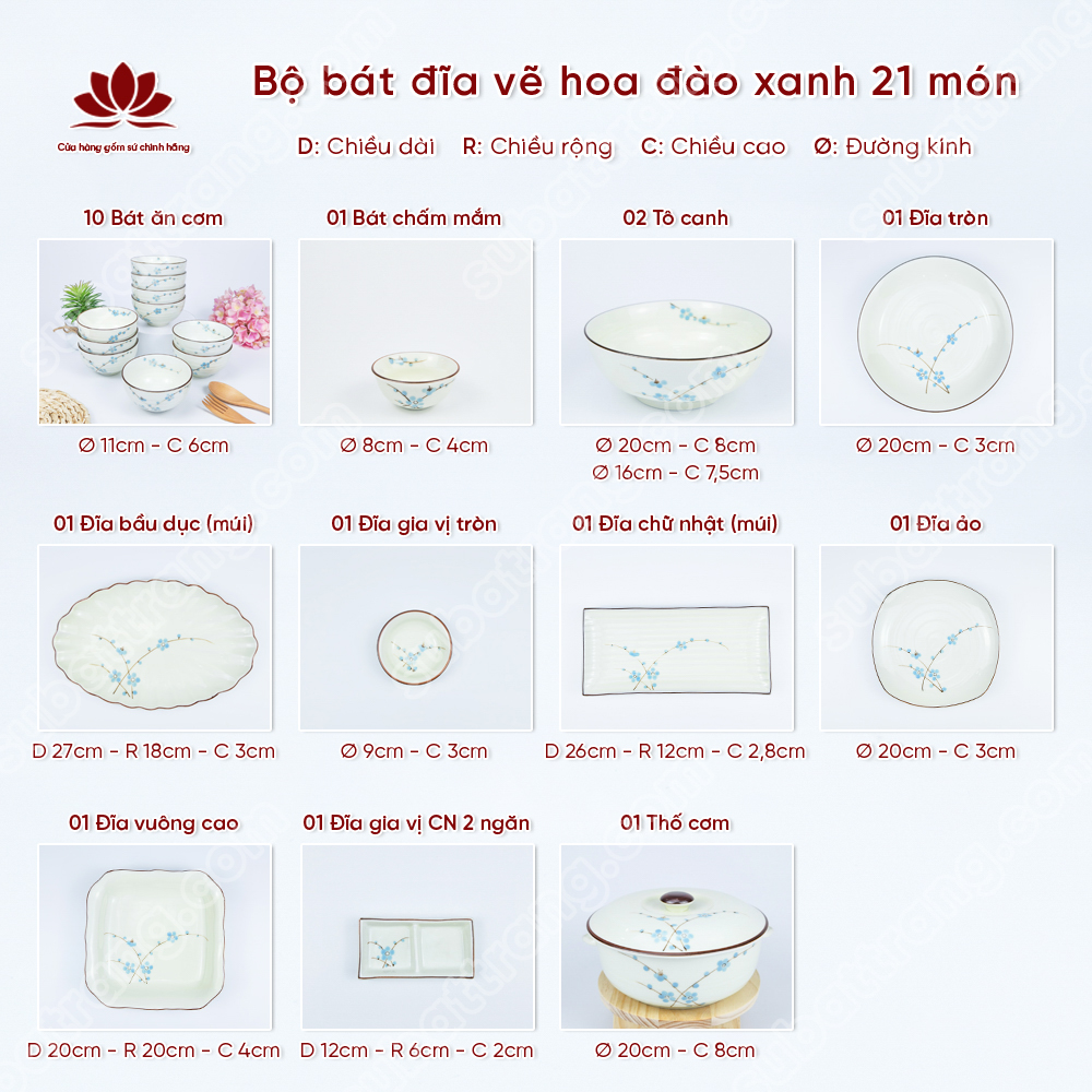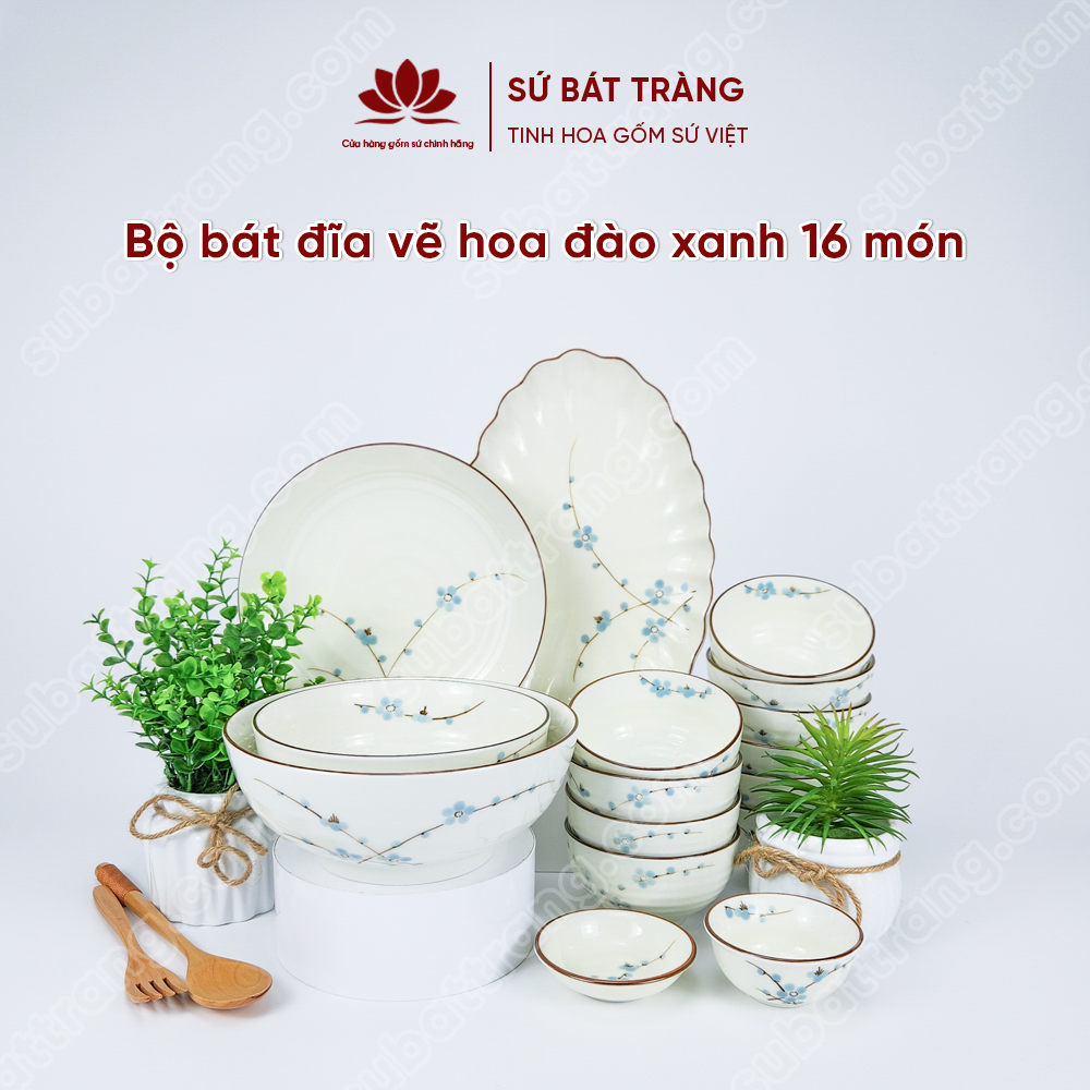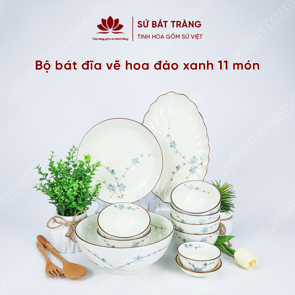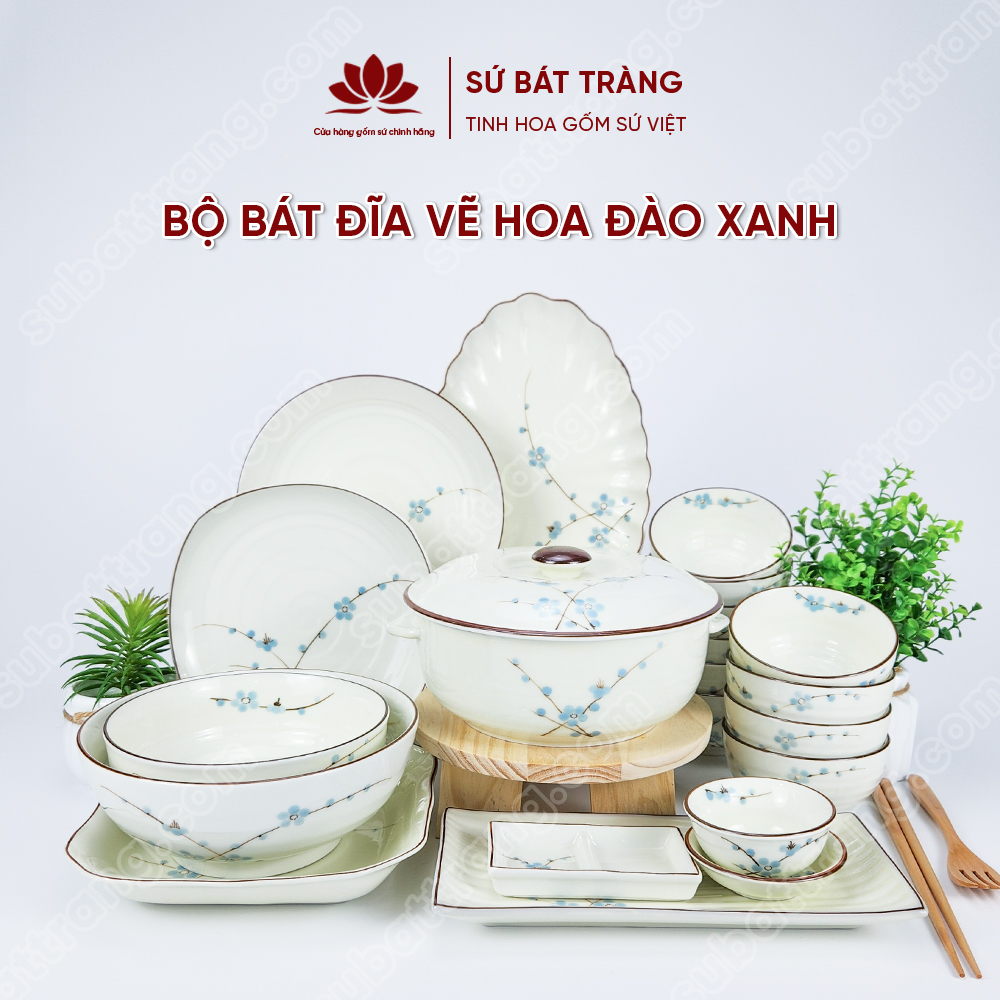 Bộ bát đĩa Bát Tràng men kem vẽ hoa đào xanh mẫu 02 thích hợp là món quà tặng, quà biếu tinh tế, ý nghĩa đến người thân, bạn bè những dịp tân gia, hiếu hỉ