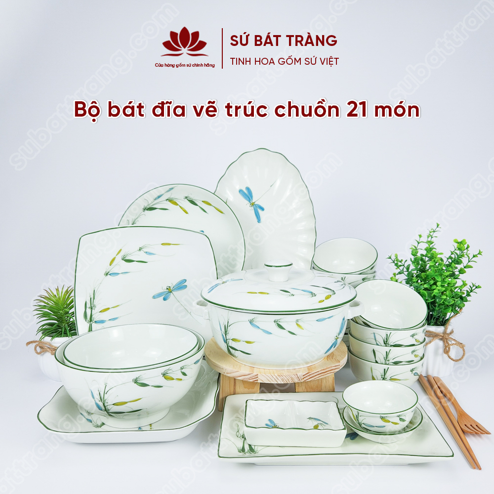 Bộ bát đĩa Bát Tràng trúc chuồn thuộc dòng bát đĩa cao cấp mang thương hiệu gốm Bát Tràng sở hữu thiết kế đơn giản, tinh tế kết hợp với màu sắc và hoa văn tinh xảo, đẹp mắt đã tạo nên bộ sản phẩm phù hợp với mọi căn bếp của những người nội trợ.