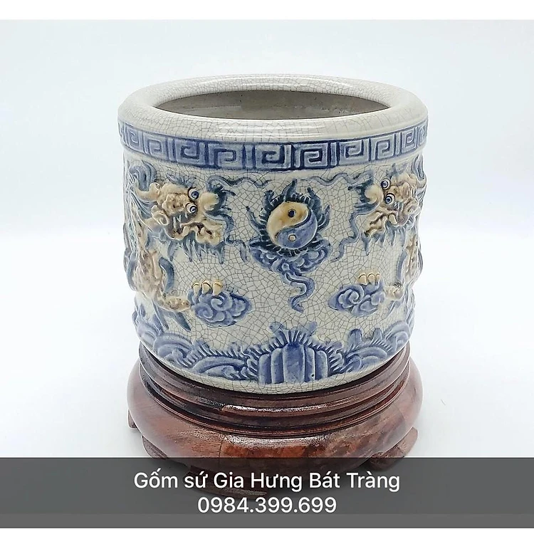 Bộ bát hương men rạn đắp nổi gốm sứ Bát Tràng( kèm chân đế ghỗ hương)
