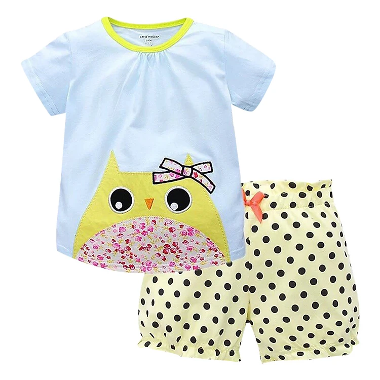 - Sản phẩm được lên form xinh xắn, áo có hình cú đeo nơ kết hợp với quần chấm bi có đính nơ ở giữa tôn lên sự đáng yêu cho các bé gái.