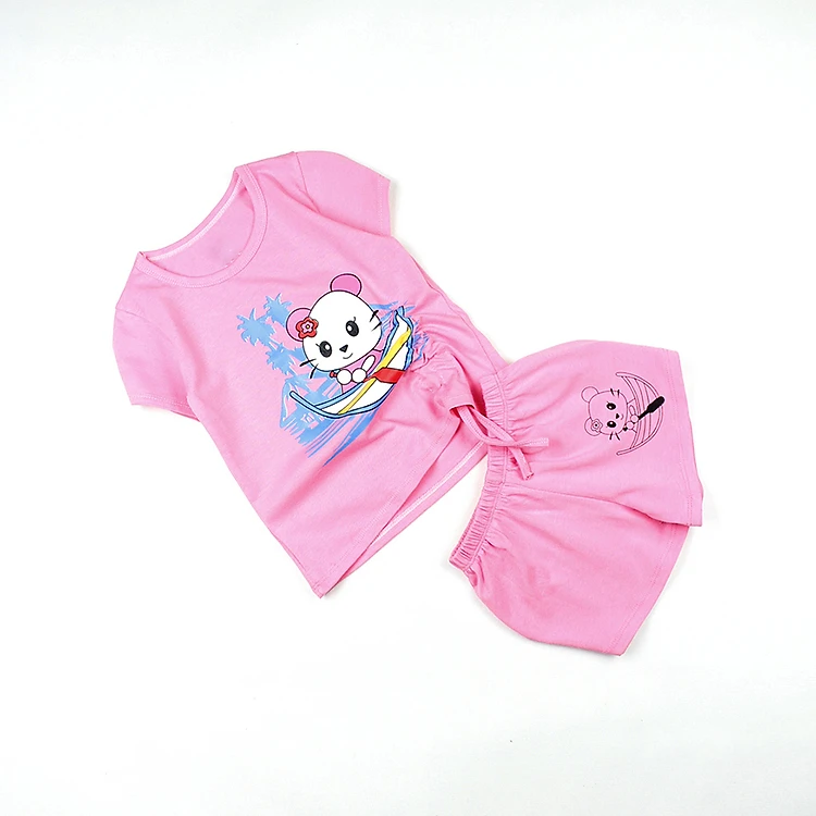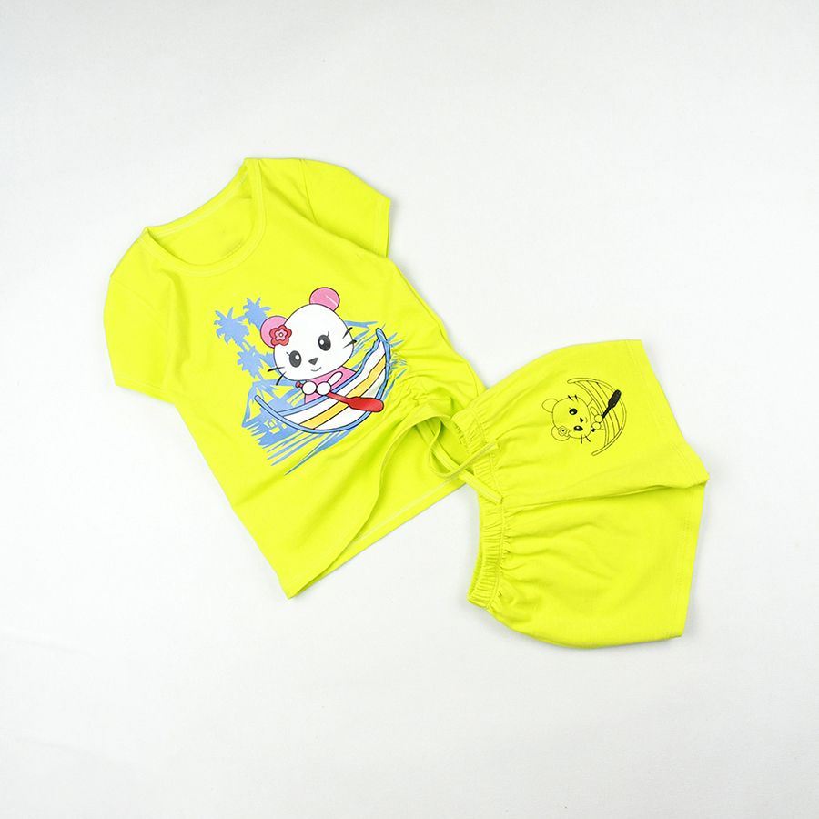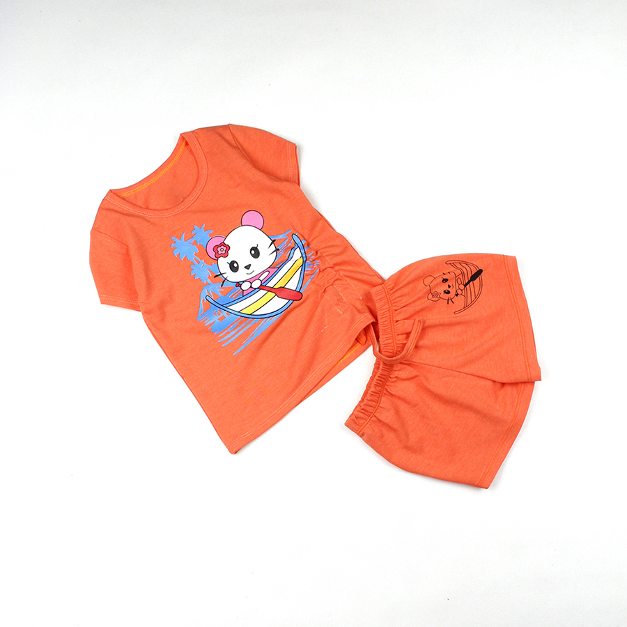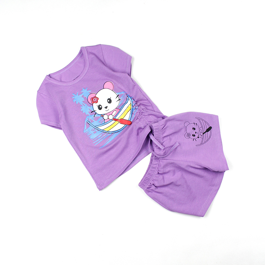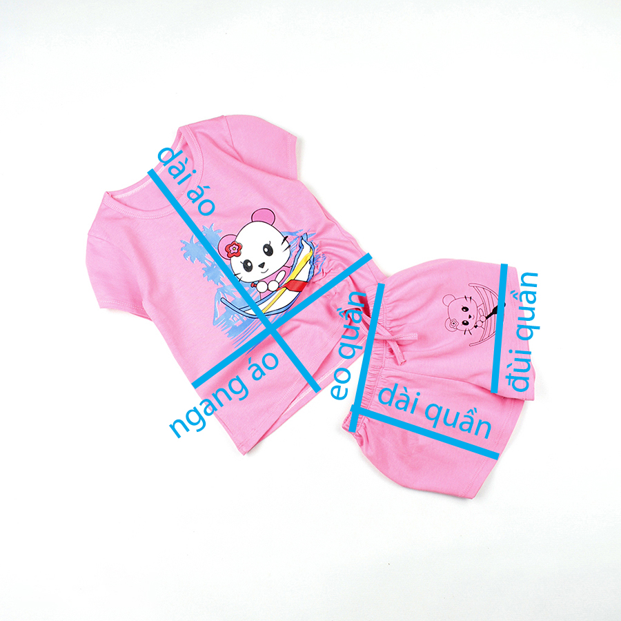 - Bộ bé gái áo áo rút dây in hình mèo con được may từ vải thun 100% cotton 4c.