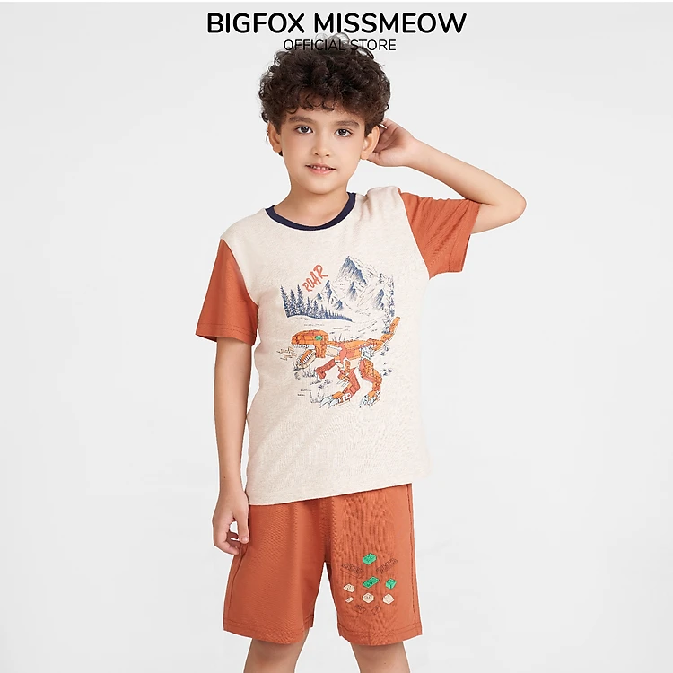 Bộ bé trai mùa hè Bigfox Miss Meow, chất cotton xuất Hàn, kiểu cộc tay in khủng long size đại 3,6,9,10,11 tuổi 30kg 40kg 1909