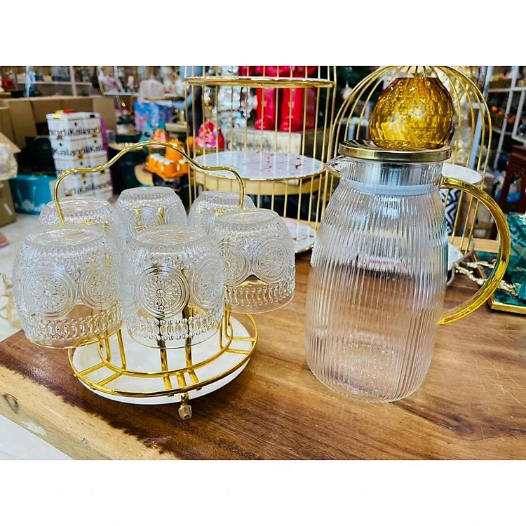 BỘ BÌNH ĐỰNG NƯỚC UỐNG KEMG 6 CỐC VÀ GIÁ ÚP CỐC MÀU VÀNG SANG TRỌNG
