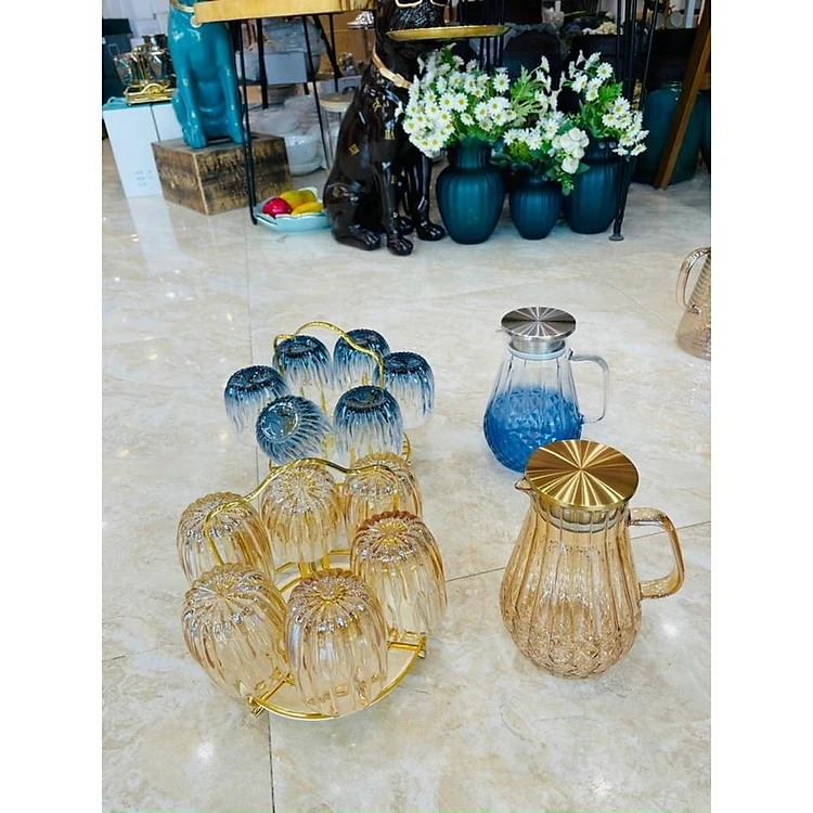 BỘ BÌNH ĐỰNG NƯỚC UỐNG KEMG 6 CỐC VÀ GIÁ ÚP CỐC MÀU VÀNG SANG TRỌNG