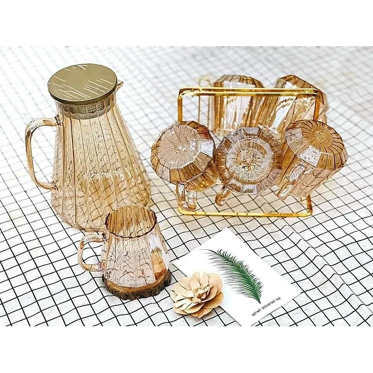 BỘ BÌNH ĐỰNG NƯỚC UỐNG THỦY TINH KÈM 6 CỐC VÀNG SỌC VÀ GIÁ ÚP CỐC - VD106